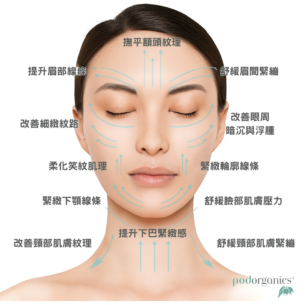 - 適用於臉部、下顎、頸部、胸部、乳房等部位進行物理性按摩,協助日常保養及舒緩肌膚壓力。