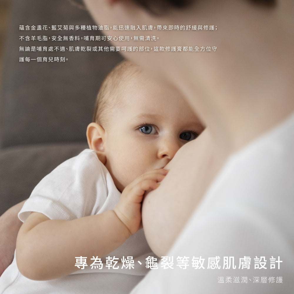 專為乾燥、龜裂等敏感肌膚設計,不含羊毛脂的修護膏,溫柔滋潤、深層修護,讓哺育期的媽媽安心無憂。