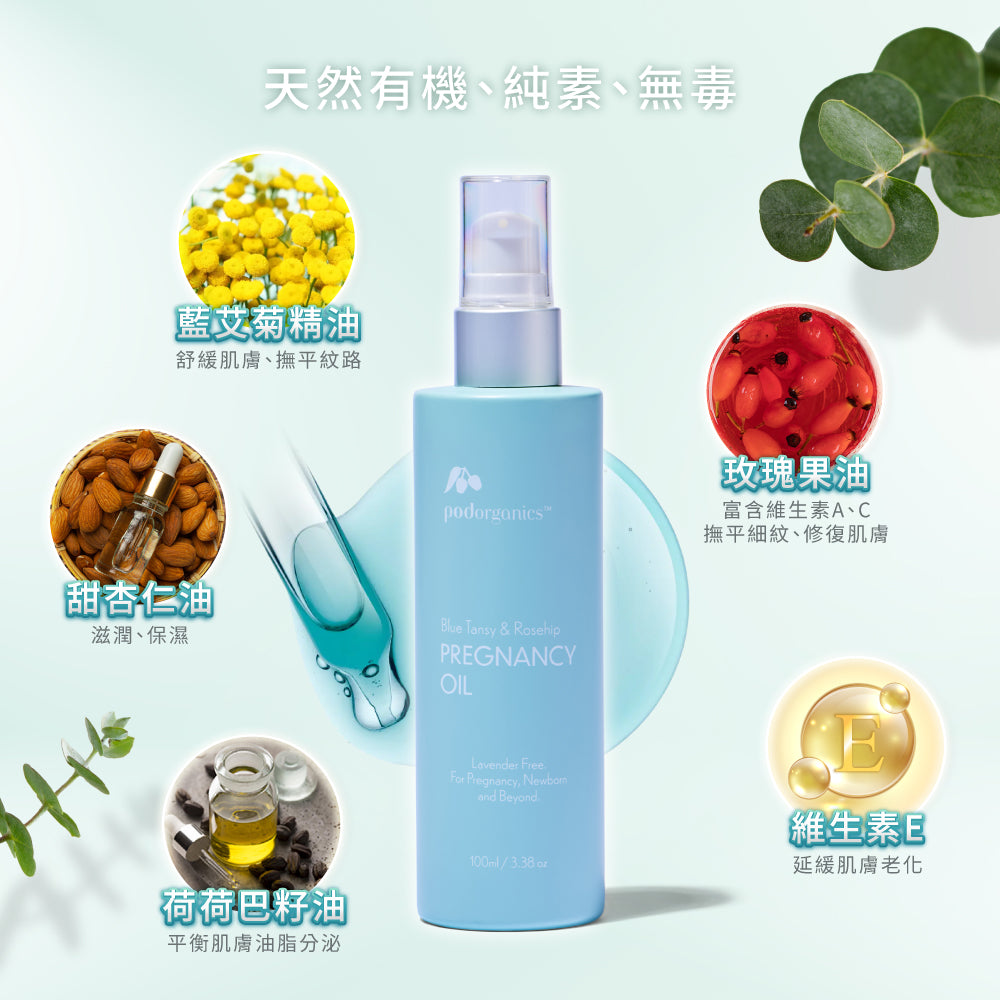 專為孕期肌膚設計,一款質地柔滑、富含營養的孕膚護理油,深層滋潤腹部肌膚,調理肌膚紋路,舒緩因延展而產生的不適感。 蘊含有機藍艾菊、荷荷芭油與玫瑰果油,成分天然純淨,讓每日護膚成為一種溫柔的放鬆儀式。