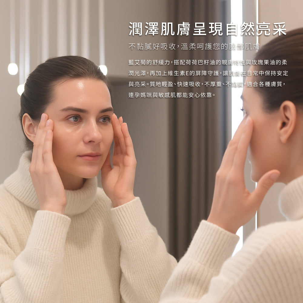 藍艾菊的舒緩力,搭配荷荷巴籽油的親膚特性與玫瑰果油的柔潤光澤,再加上維生素E的屏障守護,讓肌膚在日常中保持安定與亮采。質地輕盈、快速吸收,不厚重、不黏膩,適合各種膚質,連孕媽咪與敏感肌都能安心依靠,維持肌膚水潤光澤與舒適,不會造成毛孔負擔,平衡肌膚呈現自然亮采。
